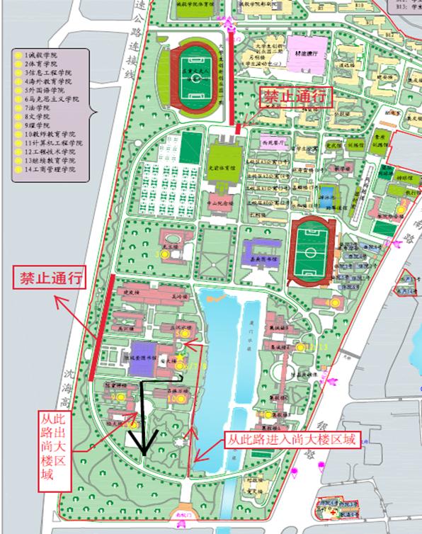 2.尚大楼两侧道路封闭,车辆从南校门沿人工湖侧道路进入尚大楼地下车库,沿章辉楼和陆大楼道路出尚大楼。