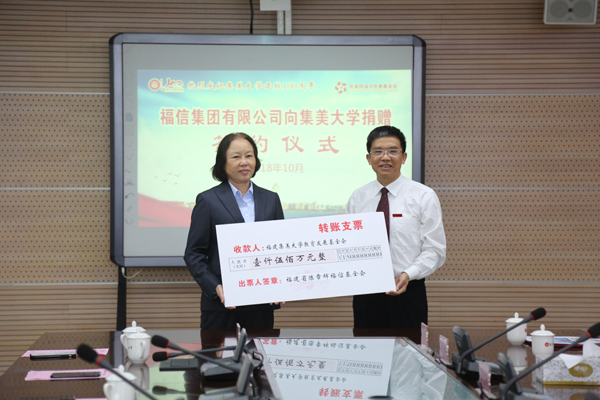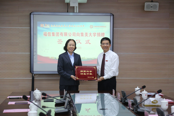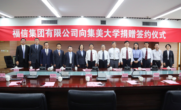 10月17日,我校与福信集团有限公司签订捐赠协议,福信集团有限公司向我校捐1500万元,并祝福百年集大欣欣向荣、未来更加辉煌。