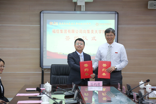 福信集团的创始人陈章辉先生、现在的吴迪董事长是我校杰出校友。从福信集团创立以来,我校有一大批优秀校友投身福信集团的建设发展。早在1993年,陈章辉先生创立福信集团之初,就向我校捐赠100万元设立“福信教育基金”,为福信集团种下了传承嘉庚精神的种子。自2003年以来,在吴迪董事长的主持下,福信集团主动认募集美大学发展基金,倾情资助学校的发展,而今集大校园内巍峨壮观的“章辉楼”“福信楼”“大唐楼”就是明证。在福信集团的倾力帮助下,我校教育事业取得了蓬勃发展,学校的办学条件和校园环境明显改善,办学水平和办学质量不断提高。
