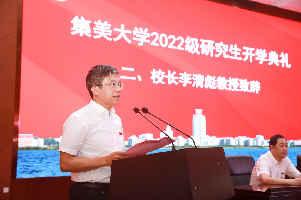 校长李清彪代表学校党政领导和全体师生员工对1109名2022级研究生的到来表示欢迎和祝贺,并作了《广览博学 深钻精研》的主题讲话。他鼓励2022级研究生一要广览博学,融会贯通能致远,从他山之石可以攻玉、学科之间交叉融合、跳出学科专业局限三个层面来达到博学通识的目的,不断积蓄出广博的学术根基,培养出优秀的文化素养和深厚的学养底蕴。二要深钻精研,术有专攻成特专,要对具体课题任务要有一往情深的专注,聚焦问题的关键,心无旁骛、坚毅果敢地做下去。要有穷尽学理的钻研精神,聚焦科学问题,深入深入再深入,还要有精益求精的态度,精细对待学习科研中的每一个环节、每一个步骤,才有利于根本上的科学发现与创新。他希望全体2022级研究生能传承“诚以致诚 毅以达毅”的品格追求,努力修炼“诚于学术 毅于钻研”的科学素养,使自己成为具有丰富的人文修养,严谨的科学态度,精湛的技术能力,能够解决复杂的社会和工程问题的广博精专的高级人才,以优秀的表现为学校增光添彩!