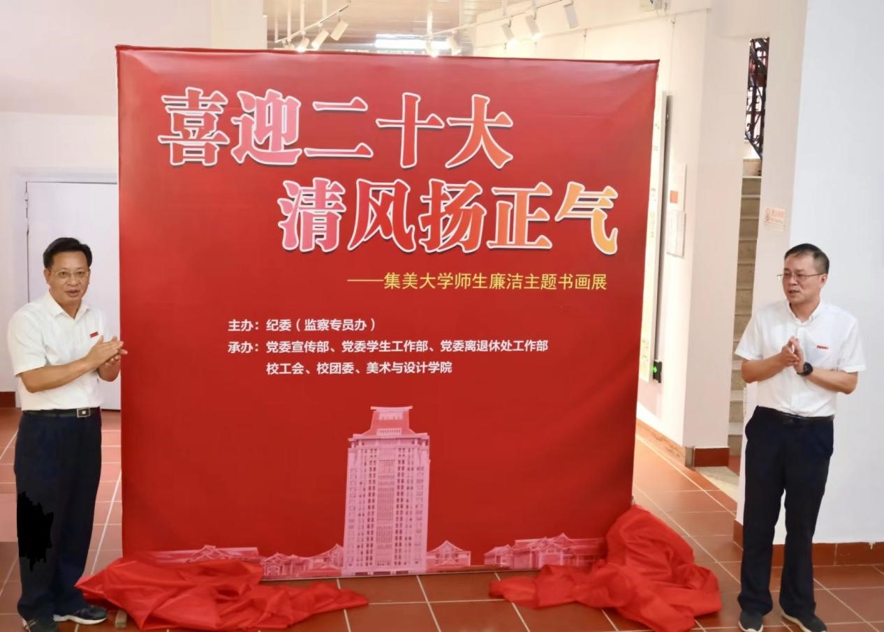 9月29日,由校纪委(监察专员办)主办,党委宣传部、党委学生工作部、党委离退休工作部、校工会、校团委、美术与设计学院联合承办的“喜迎二十大,清风扬正气”集美大学师生廉洁主题书画展在校美术馆隆重开幕。校党委书记沈灿煌,校党委常委、纪委书记、监察专员童建福,相关职能部门主要负责人,书画作者及部分师生代表共同参加揭幕仪式。