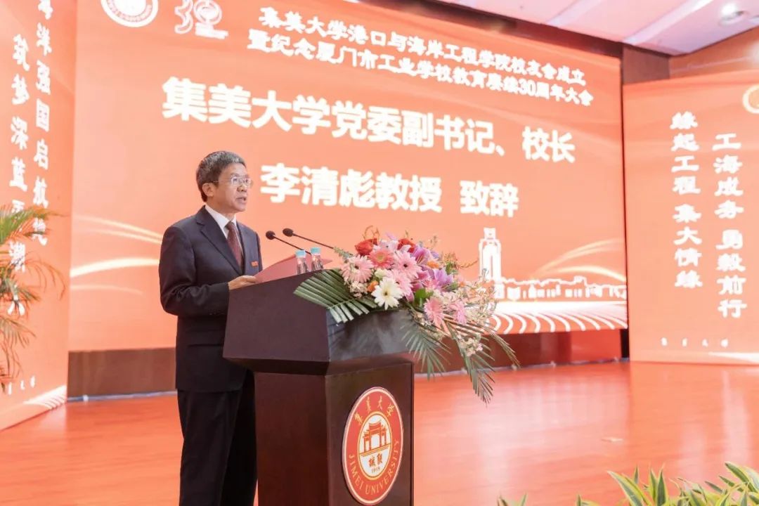校长李清彪简要回顾了校主陈嘉庚先生创办的职业教育体系,介绍了厦门市工业学校、集美大学港口与海岸工程学院的发展历程。他指出,作为新集大人,厦门工校的教职员工潜心教学、悉心育人,专心科研、勇于创新,坚守初心、担当进取;港口与海岸工程学院在学校发展进程中顾全大局,在转型融合中突破升级,在改革调整中抢抓机遇,在开拓发展中实现跨越。在新、老集大人的共同努力下,学院各项事业发展连续取得新发展、新突破,广大校友在各个领域开拓进取、建功立业。他强调,当前,学校正处于加快建设“工海”特色更加鲜明的一流大学的关键时期,学校将深入学习贯彻党的二十大精神,大力弘扬嘉庚精神,主动融入服务国家省市发展新格局,在以中国式现代化全面推进中华民族伟大复兴的征程中展现集大担当、做出集大贡献。希望广大校友心怀诚毅、不负家国,心系母校、共创一流,心念团结、共同发展;希望学院和校友会进一步完善校友工作组织体系,加强服务,为校友之间、校友与母校之间搭建更多交流合作平台,为校友事业发展提供更多、更有力的支持。