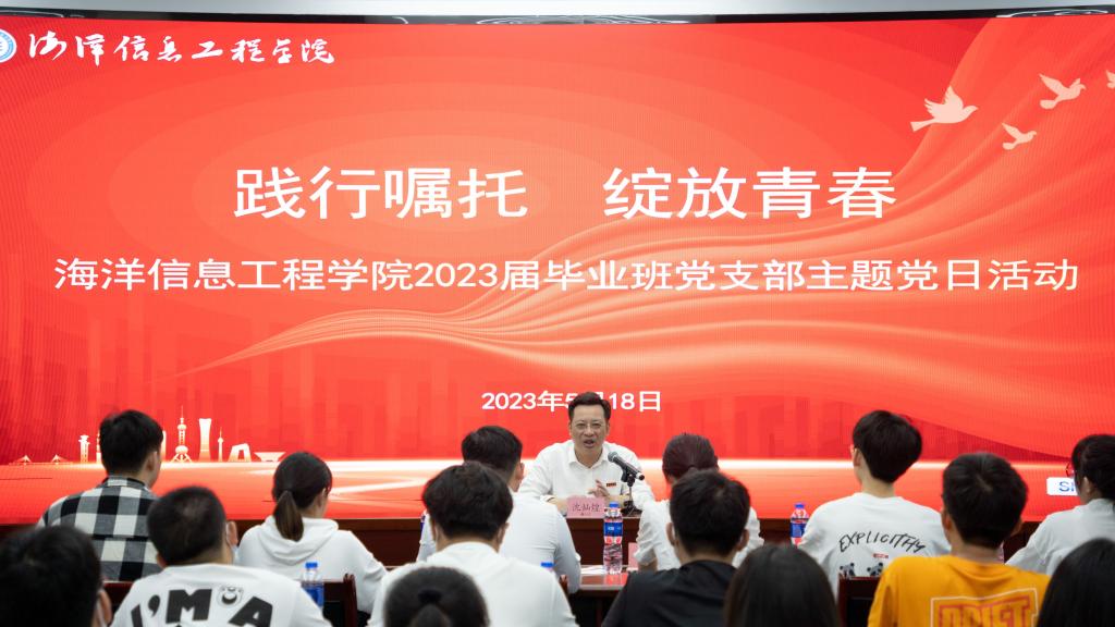 5月18日,校党委书记沈灿煌到海洋信息工程学院参加“践行嘱托 绽放青春”毕业班党支部主题党日活动,并上主题教育专题党课。