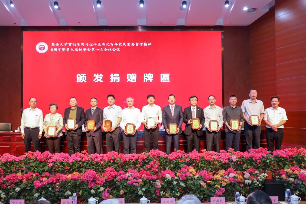 近五年来,集美大学广大校董、校友弘扬捐资兴学义举,全力支持学校建设发展。校领导沈灿煌、谢潮添共同为作出突出贡献的个人及单位授予“捐资兴学、功在千秋”卓越贡献奖牌匾。