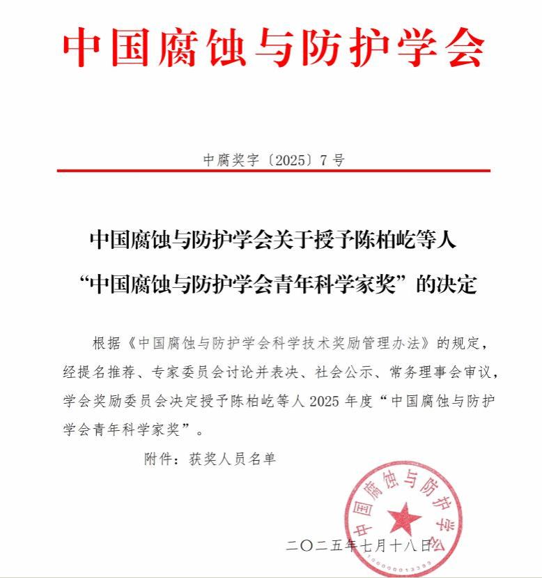 近日,中国腐蚀与防护学会公布2025年度青年科学家奖获奖名单。我校轮机工程学院陈柏屹教授凭借其在海洋装备生物污损防护领域的原创性技术突破,获此殊荣。