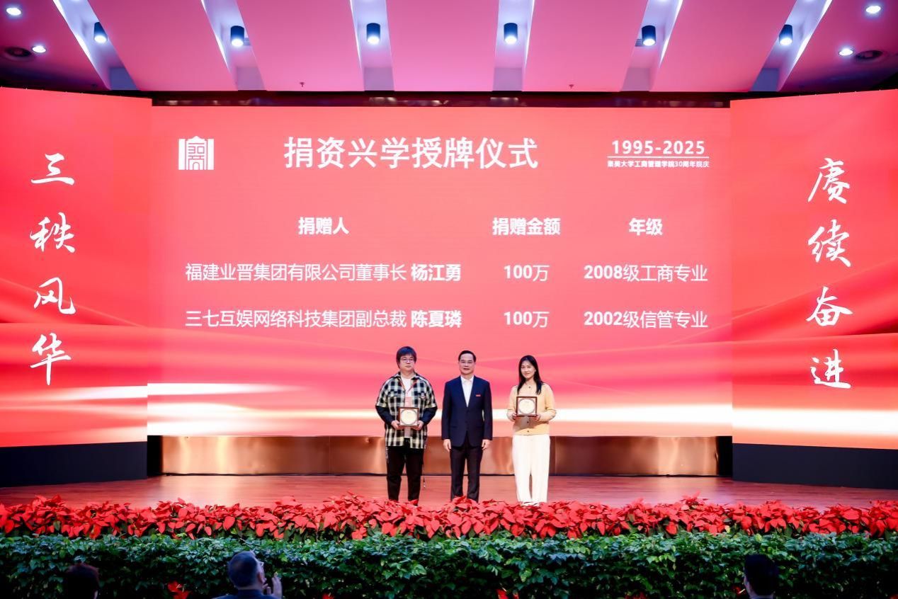 校友代表贺业敏和教师代表陈岩英分别发言。大会还举行了“薪火相传·致敬耕耘”退休教师献花仪式、“三十载管院情,薪火向新行”主题朗诵、捐资兴学授牌仪式以及政产学研合作协议签订等。