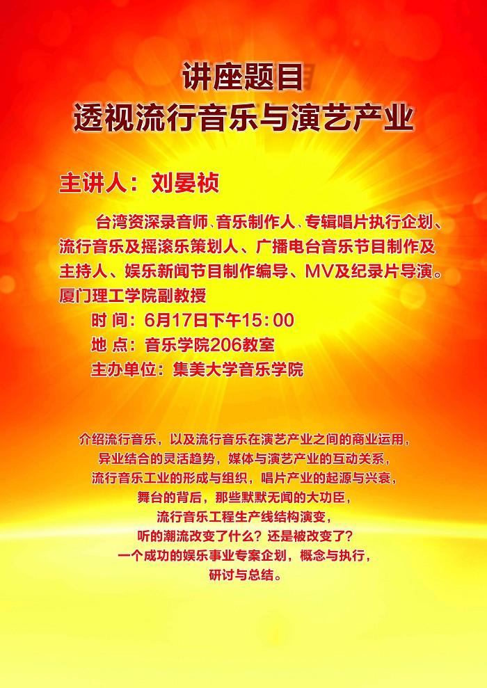 介绍流行音乐,以及流行音乐在演艺产业之间的商业运用,异业结合的灵活趋势,媒体与演艺产业的互动关系,流行音乐工业的形成与组织,唱片产业的起源与兴衰,舞台的背后,那些默默无闻的大功臣,流行音乐工程生产线结构演变,听的潮流改变了什么?还是被改变了?一个成功的娱乐事业专案企划,概念与执行,研讨与总结。