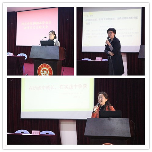 活动中,学院3名学生代表进行了实习总结发言,表示实习让她们体会了从学生到教师的角色转换,在实践过程中丰富了自己的教学经验。