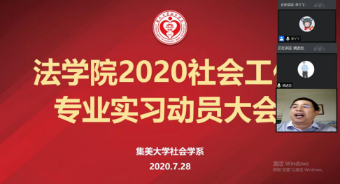 为进一步做好疫情防控期间的学生专业实习工作,稳步推进实习工作的开展,7月28日晚7点,法学院于腾讯会议云端召开2020年社会工作专业实习动员大会,法学院副院长姚进忠、副书记陈开燕、社会学系所有教师、17级全体学生以及19级全体研究生出席本次会议。会议由社会学系系主任李静雅主持。