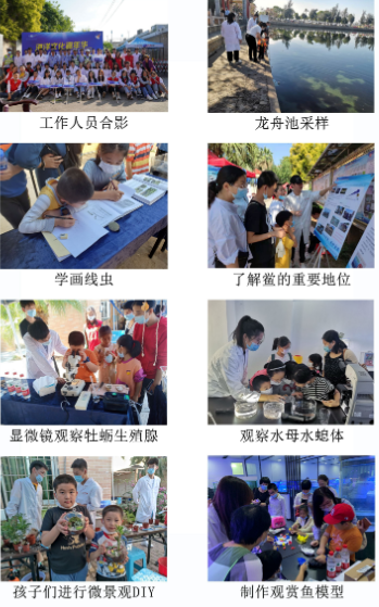 本次活动从网上预约时就火爆异常,学院结合教师科研特长,共设计了观赏鱼、水母、珊瑚、桡足类、牡蛎、海胆、微景观、鲎、青蟹、鳗鲡和紫菜十一个展示项目。为避免“眼观手勿动”模式的单调,每个项目还分别设计了科普讲解、显微观察、野外采样、生物(水母、观赏鱼)“0”距离、微景观设计等不同的互动,做到了“眼睛看、耳朵听、脑子想、小手动”,为小朋友和家长带来了“沉浸式”的体验。