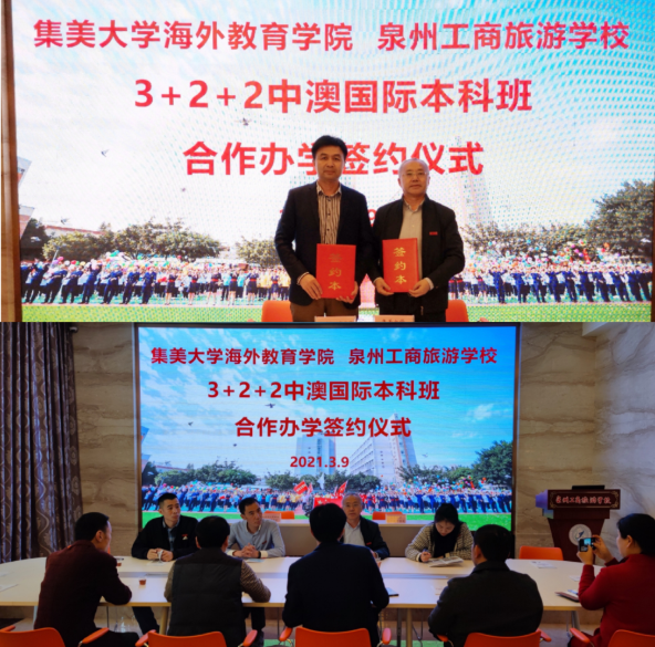 3月9日下午,海外教育学院副院长陈同文,学院综合办公室、招生与培训办公室和教学办公室相关老师一行访问泉州工商旅游学校,双方就开展出国留学培训合作、共建优质生源基地等事宜进行探讨和交流,并正式签订了合作办学协议书。