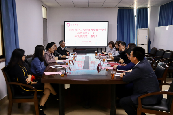 3月22日下午,山东财经大学会计学院党委书记邵文涛一行莅临财经学院,于亲民楼五楼会议室举行调研座谈。财经学院党委书记兰莉芸、副书记李海川及会计系负责人参与座谈。