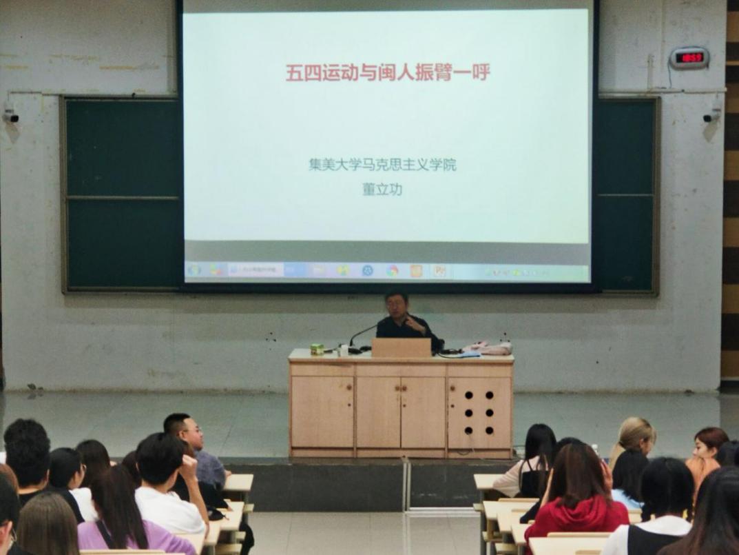 董立功从《新青年》杂志的创办到一大批优秀的北大教授和学生领袖的发声为同学们介绍了新文化运动的兴起。他从严复对五四运动的态度、冰心的回忆以及郑振铎和许地山等人与五四运动的关联丰富地展现闽人与五四运动的关系,让同学们看到了闽南人与五四运动之间千丝万缕的联系。