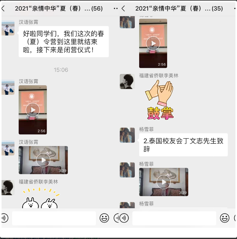 班主任和营员代表发言。泰国的梁文聪老师感谢海外教育学院老师精心设计教学内容和互动方式,带领海外华裔青少年度过了一段美好的中华传统文化和福建民俗民风之旅。泰国营员张晓星同学表示通过此次网上学习,不仅提高了自己的汉语听说水平,也更深刻地感受到中华文化的魅力,希望有机会来中国学习。