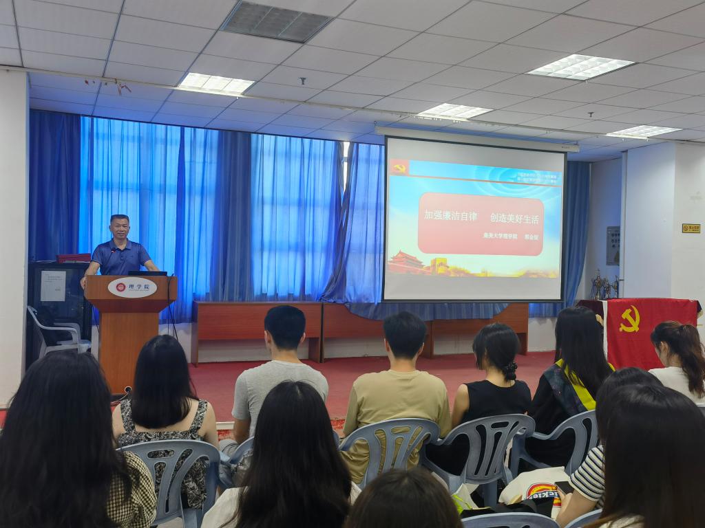在此次主题党日活动中,全体毕业生党员在杨敏的带领下齐唱国歌,重温入党誓词。郭金锭作《加强廉洁自律 创造美好生活》专题辅导报告,结合中国共产党廉洁自律准则告诫大学生在赓续嘉庚精神血脉的同时,从业道路上要做好贯彻落实中央“八项规定”精神,坚决反对“四风”,牢固树立“四个意识”,坚定“四个自信”,做到“两个维护”,永远保持心中有党、心中有民、心中有责、心中有戒。