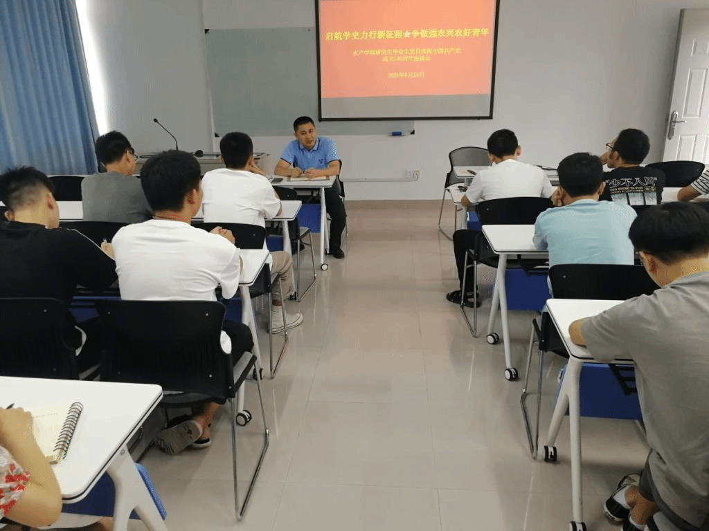 为庆祝中国共产党成立100周年,加强毕业生党员离校思想教育,6月24日,水产学院举办“启航学史力行新征程 争做强农兴农好青年”党史学习教育座谈会,院党委副书记黄庆胜、组织员以及2021届研究生毕业生党员代表参加了座谈会。