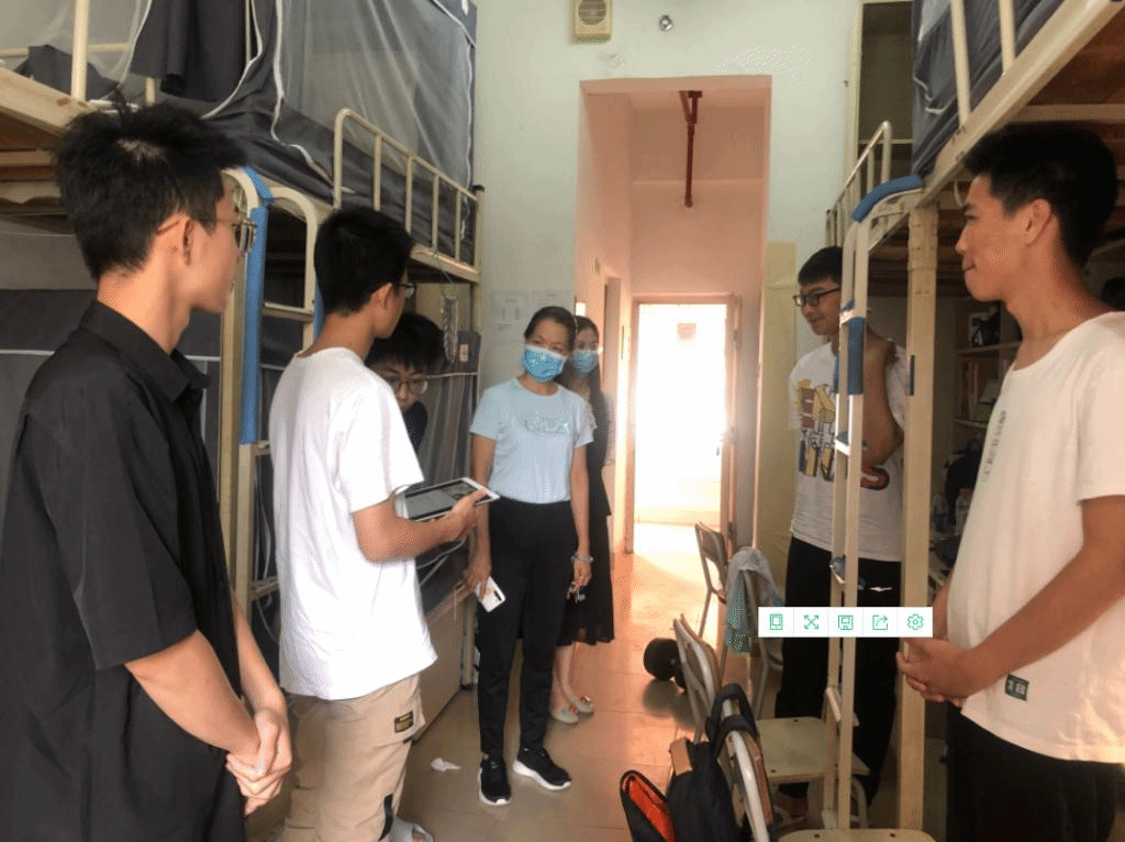 10月1日国庆节之际,工商管理学院党委副书记林芙蓉、全体辅导员下沉到学生宿舍,继续开展疫情防控专题走访活动,为学生送去节日的问候。