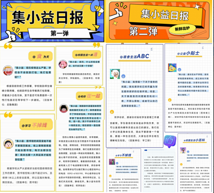 为践行“全心全意服务同学”的工作宗旨,配合学校做好疫情防控工作,校学生会于近日开设“集小益”信息反馈平台,听取、收集同学们在校园学习生活方面的普遍需求和现实困难,及时反映给学校相关职能部门,帮助有效解决。平台开通以来,已收集学生反映学习、工作、生活的诉求和建议的各类留言信息80余条。平台分类整理,报送有关职能部门处理,得到了各部门的高度重视和及时回复和解决。“集小益”工作平台通过“集小益日报”专栏,以推送形式定期梳理和发布问题回复和处理的情况,同时努力推动有关问题的解决,收获了同学们的好评和肯定。