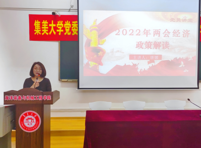 4月13日,由海洋装备与机械工程学院党委主办的党员讲堂第五十三讲在大唐0211室举行,马克思主义学院教师唐娜应邀为学院全体教职工作题为《2022年全国两会经济政策解读》辅导报告。