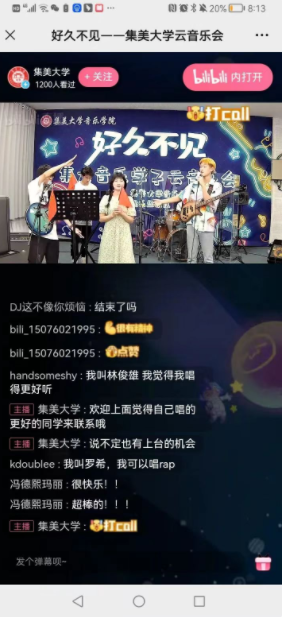 4月14日晚,音乐学院通过集美大学官方哔哩哔哩平台举行“好久不见——集大音乐学子云音乐会”,音乐学院桃乐丝乐队的同学们通过线上直播的方式,为全体师生献上了10首耳熟能详的歌曲,传递青春正能量。