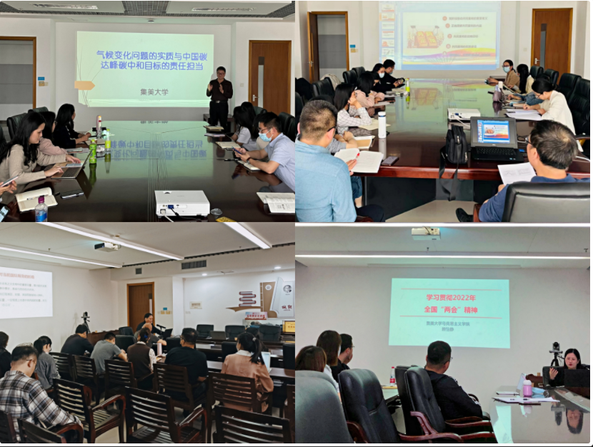 备课会上,梅进禄以《气候变化问题的实质与中国碳达峰碳中和目标的责任担当》为题,分析了我国在“十四五”规划中提出的碳达峰碳中和目标的战略任务,指出碳达峰碳中和愿景的达成将为应对全球气候变化作出积极贡献。兰启发以《正确理解共同富裕的科学内涵、战略目标和实践途径》为主题,分析了现阶段推进共同富裕的重要意义、共同富裕的内涵、战略目标及其实践途径,阐述了推进共同富裕的长期性、艰巨性和复杂性。杨庆龙以《当前世界形势(国际局势)与新时代中国外交》为主题,分析了俄乌冲突、新冠疫情、中美关系对国际格局的影响以及中国的外交对策。赖怡静以《学习贯彻2022年全国“两会”精神》为题,分析了“两会”精神要点,阐明了“两会”重点关注的教育、医疗等民生问题。