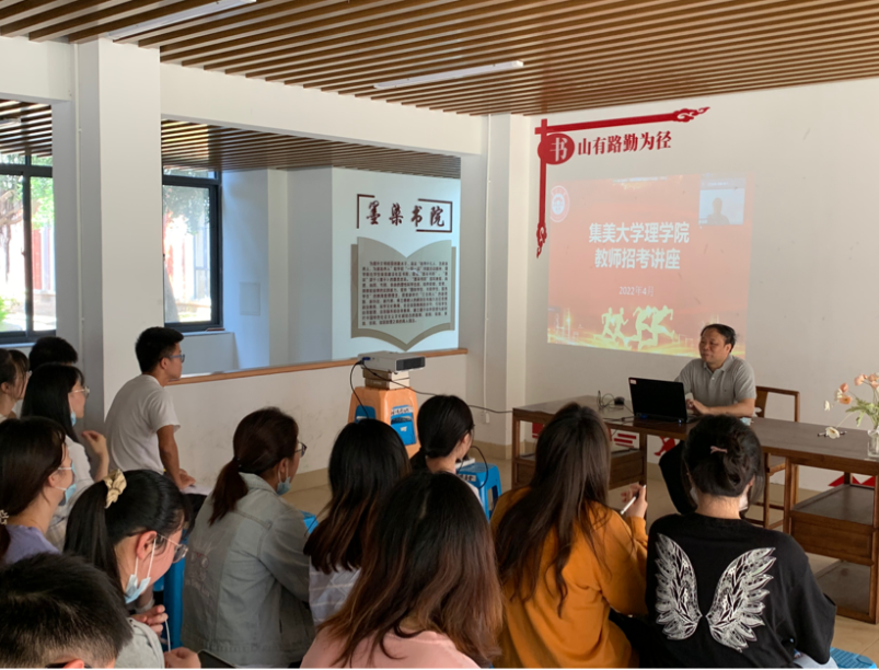 为进一步提升师范生的综合素养,加强师范类毕业生高质量备考教师招聘考试,理学院于4月12日-15日,在墨染书院召开“我为师生办实事—2022届教师招聘系列讲座”。会议邀请了福建师范大学李祎教授和闽南师范大学周仕荣教授进行线上会议讲座,理学院副院长刘小辉主持本次会议。