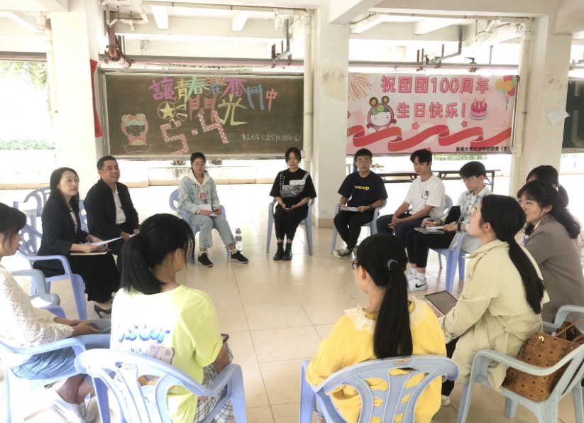 在建团百年之际,5月3日下午,海洋文化与法律学院党委书记黄煜在学生宿舍六社区四组团中庭召开学生座谈会。