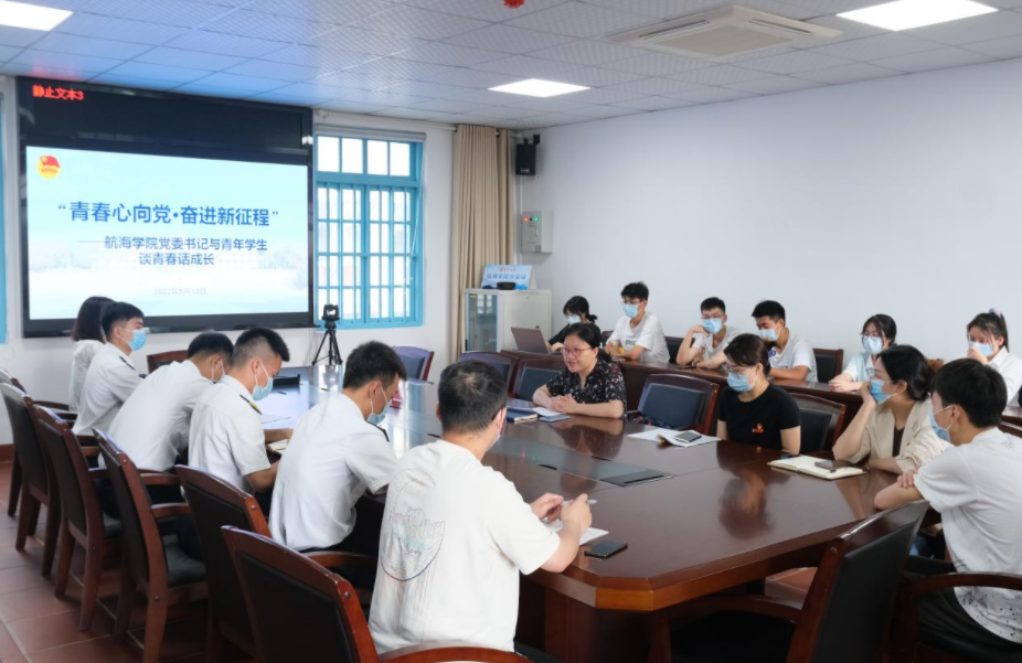 5月13日,航海学院召开“青春心向党,奋进新征程”学习贯彻习近平总书记在庆祝共青团成立100周年大会上重要讲话精神师生座谈会。院党委书记兰莉芸、院党委副书记曹兆平、院团委副书记黄志航、辅导员及学生代表参加会议,结合青年学生的实际情况,和青年学生“谈青春话成长”。会议由院党委书记兰莉芸主持。