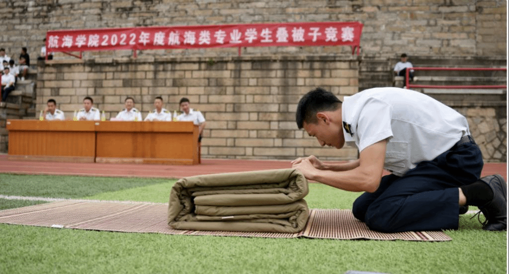 为了进一步展示半军事化管理的成果,弘扬半军事化管理精神,提高航海类专业学生军政素养,航海学院于5月21日上午举办2022年航海类专业学生叠被子竞赛。参赛的同学大显身手,将平时叠军被的技巧展现的淋漓尽致,校园卡、课本也成为选手们手中的小道具,认真谨慎地量取尺寸,按精确的宽度折叠被子。