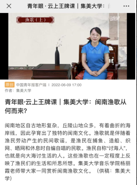 我校音乐学院杨丽霞教授的《闽南传统音乐》课程微视频近日在中国青年报客户端“青年眼·云上王牌课”栏目上线。