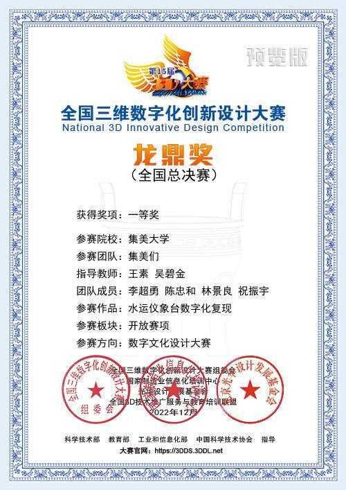 近日,第15届全国三维数字化创新设计大赛年度总决赛成功举办。海洋装备与机械工程学院的团队“集美们”在本次大赛中斩获了数字文化设计大赛的一等奖(该赛道全国排名第1位)。本次年度总决赛线上举行,共来自全国31个省、市、区,近600所院校的参赛团队组织参赛。
