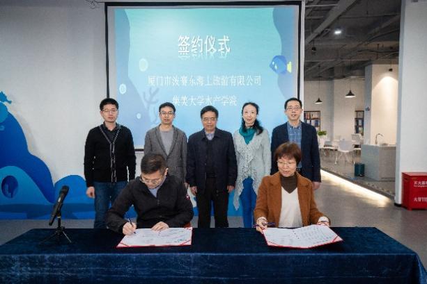 论坛另一项重要议程是产学研合作基地建设协议的签订。水产学院王淑红教授团队完成了厦门市“十三五”海洋经济创新发展示范项目“观赏海洋生物协同创新及产业化公共服务平台”的建设,并入选2022福建省优秀科普教育基地建设项目。水产学院院长张春晓、科研处副处长蔡苗等出席论坛并见证水产学院与两家企业的签约。