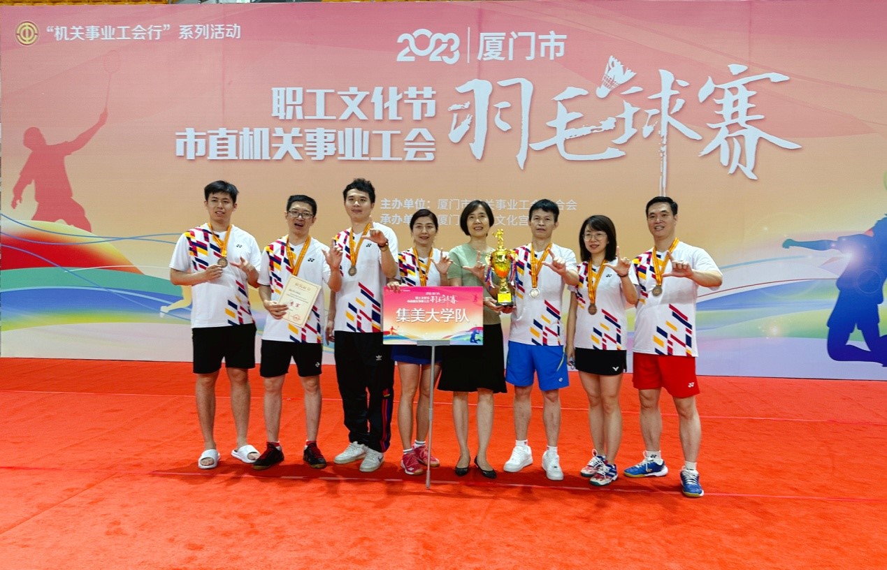 近日,由厦门市机关事业工会联合会主办、厦门市工人文化宫承办的2023厦门市职工文化节市直机关事业工会羽毛球团体赛举行,我校教师陈黎震、谢杰云、黄庆平、吴贵森、林子潇、陈豪、巫晶晶、孟媛媛组成的“集美大学教工队”经过奋力拼搏,荣获季军。