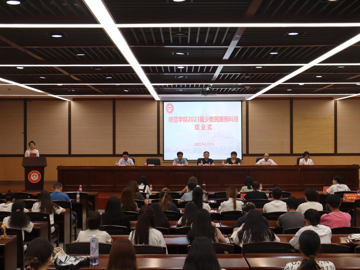 6月9日下午,师范学院2023届少数民族预科班结业式于尚大楼103会议室举行。校党委学工部副部长于宏鹏、教务处副处长郑捷琴、招生办公室副主任辛彬,师范学院党委书记田建和、院长赵红霞、党委副书记张鸿、副院长谢书书,各录取学院教师代表、民预班科任老师、班主任以及全体2023届少数民族预科班学生参加了结业式。结业式由张鸿主持。