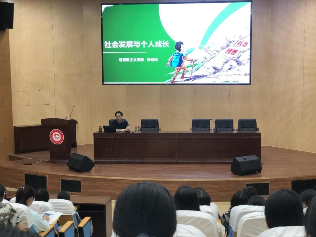 张劲松从进化学、社会学等多学科角度向同学们阐述了人的发展与社会之间的关系,通过引用马克思的一句名言“人是一切社会关系的总和”,向同学们阐述了人的自我意识在历史进程中逐步增强的过程,以此来告诫同学们要和身边的同学、舍友们和睦相处,将个人理想融入社会理想中。新生辅导员进行了入党教育,为坚定新生的理想信念注入了强大动力。