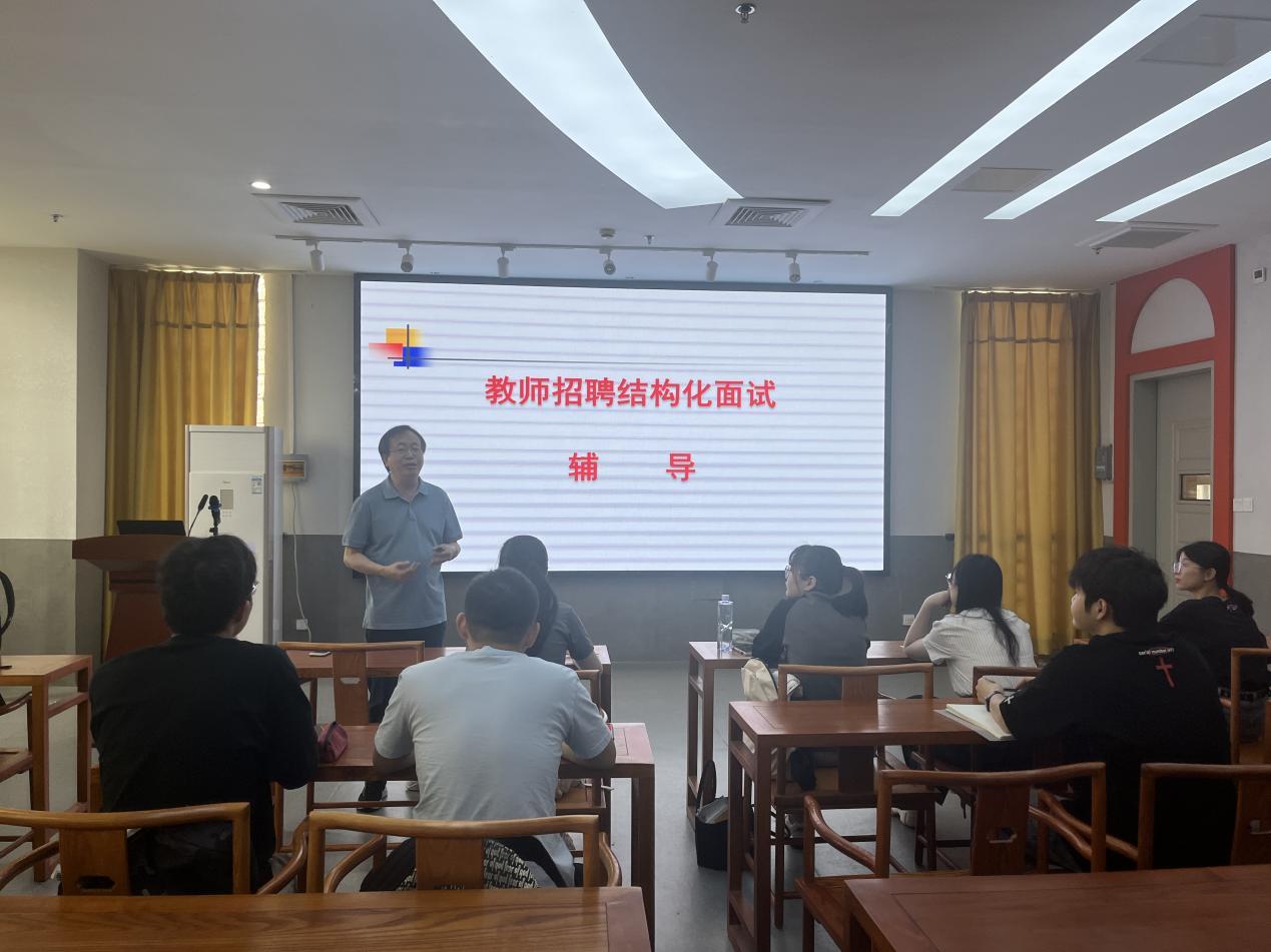 5月10日,师范学院于吕振万楼308教室举办教招面试辅导讲座。小学教育系副主任陈文胜副教授应邀主讲,2020级学生代表聆听讲座。