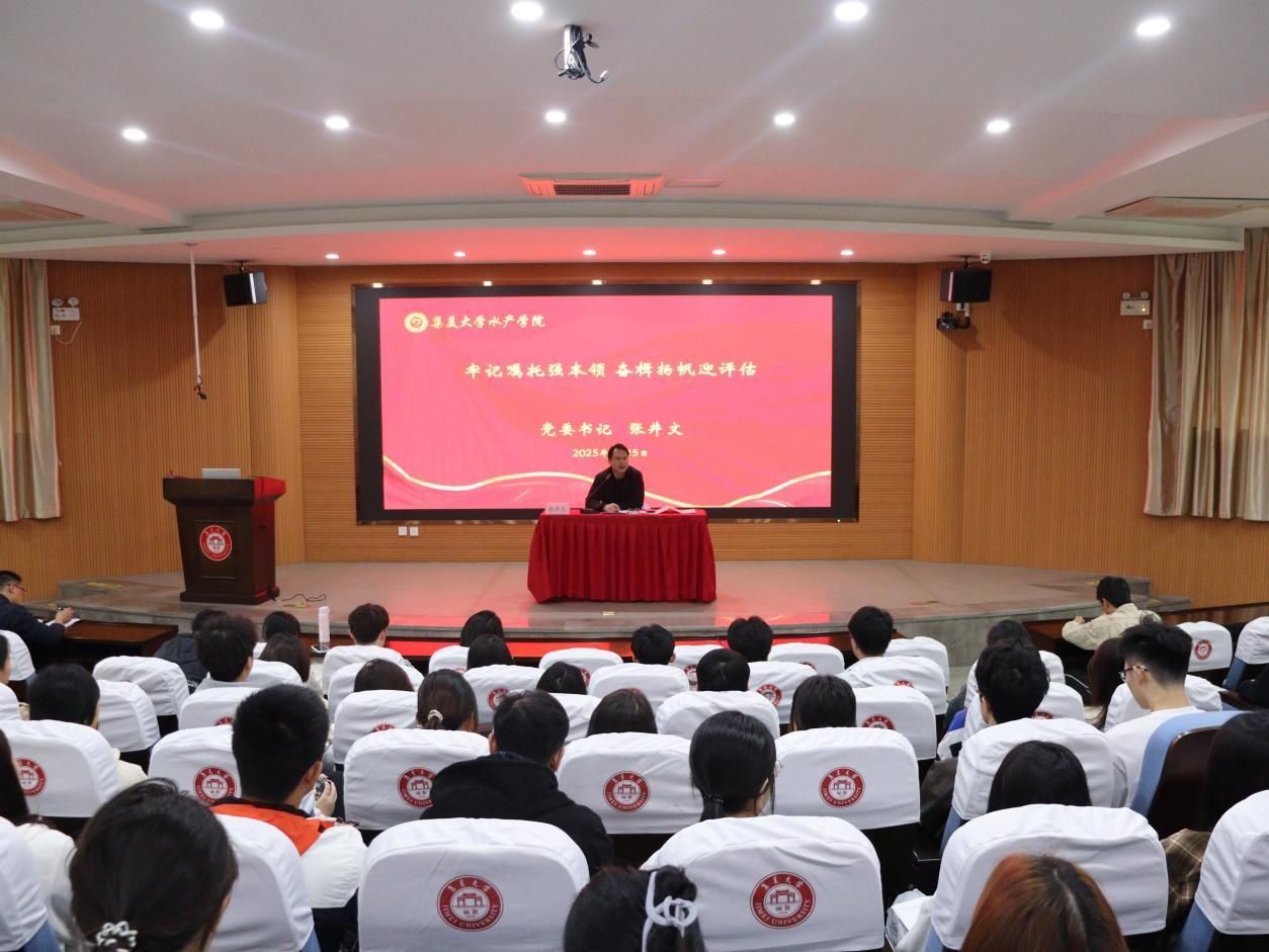 3月15日上午,水产学院党委书记张井文以“牢记嘱托强本领,奋楫扬帆迎评估”为题给学生干部代表和第三期“青马班”学员讲授专题思政课,学院全体政工干部参加。
