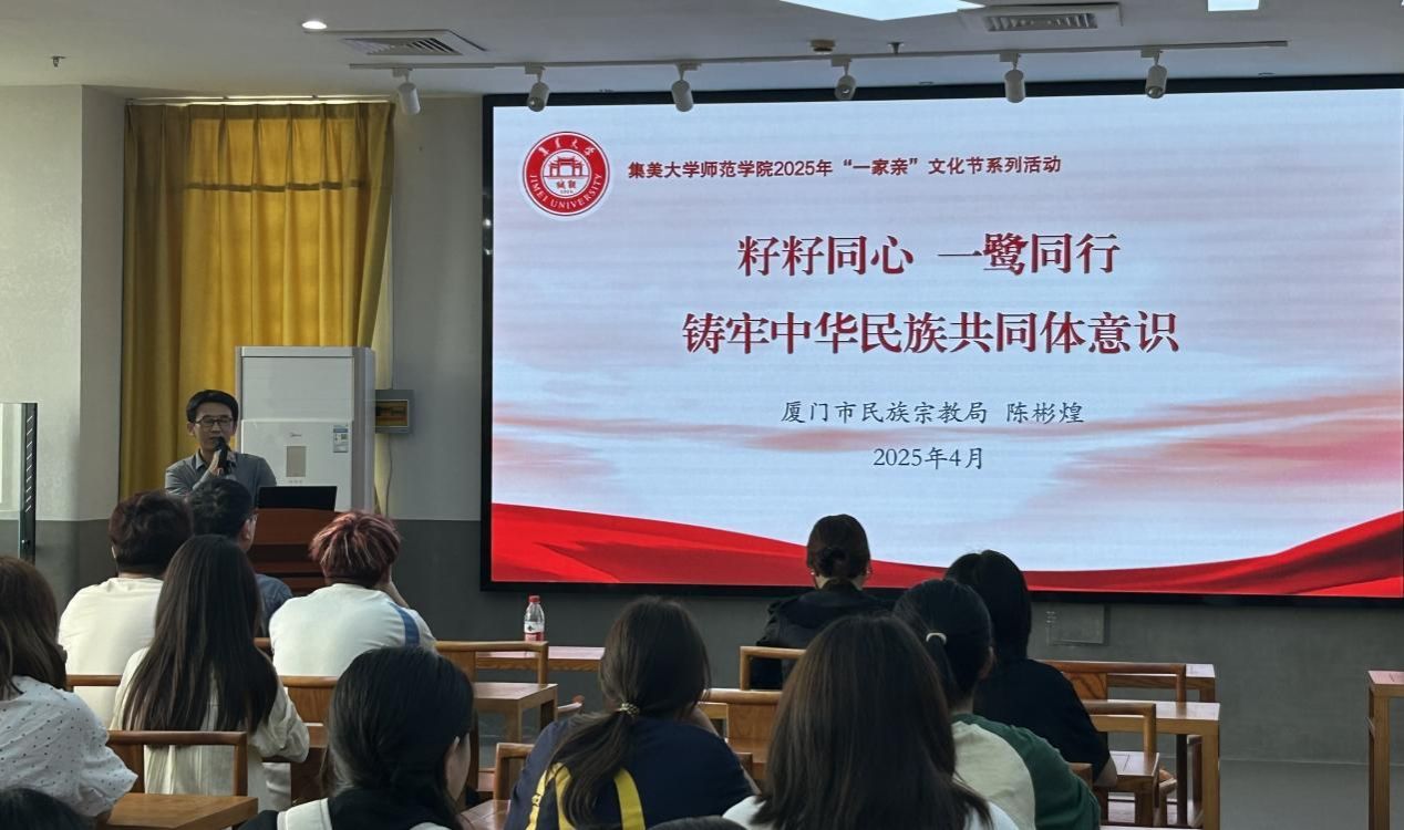 近日,师范学院举办“一家亲”文化节系列活动之“籽籽同心,一鹭同行·铸牢中华民族共同体意识”主题讲座。厦门市民宗局民族工作处处长陈彬煌受邀主讲,院党委副书记张鸿和相关师生参加活动。