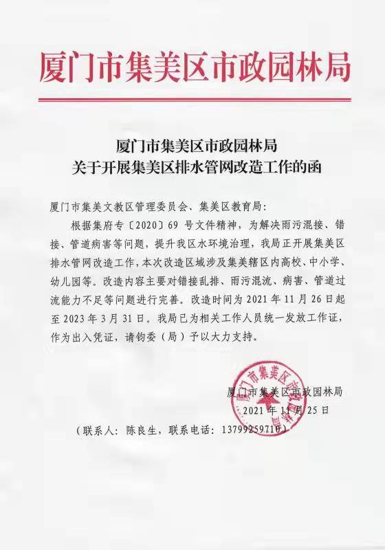 附件:厦门市集美区市政园林局关于开展集美区排水管网改造工作的函