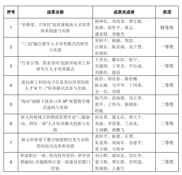 近日,福建省教育厅公布了2022年省级教学成果奖评选结果,我校《“多维度、立体化”高质量航海人才培养体系构建与实践》等8项成果获奖,其中特等奖1项、一等奖2项、二等奖5项。