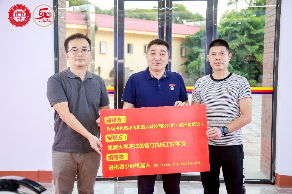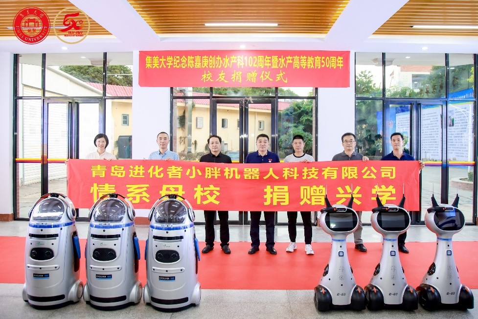 在集美大学纪念陈嘉庚先生创办水产科102周年暨水产高等教育50周年之际,海洋装备与机械工程学院机设96级校友、青岛进化者小胖机器人科技有限公司董事长兼CEO魏然向学院捐赠16台进化者小胖机器人。