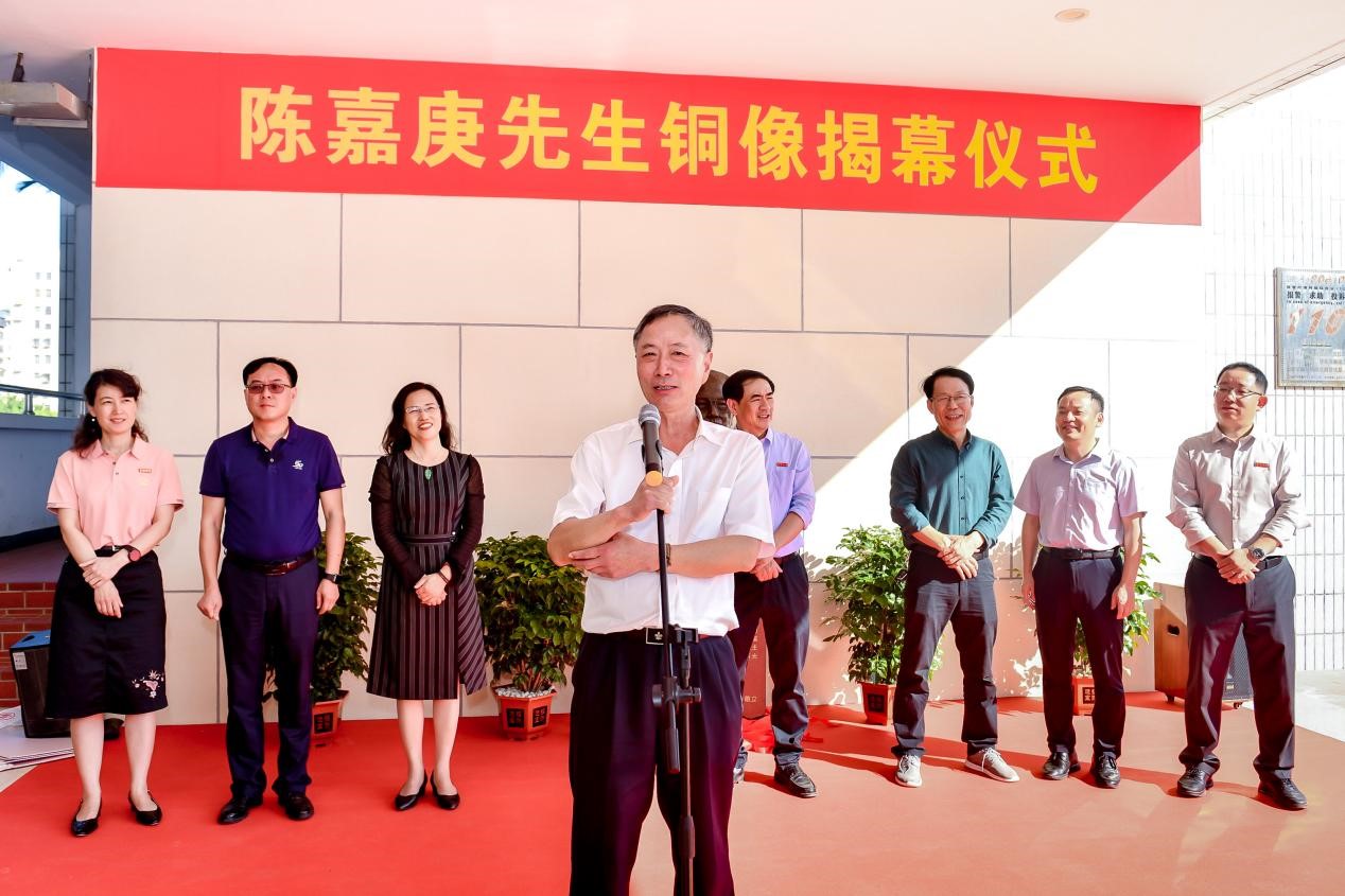 陆元旦讲话,他表示,学生时代受嘉庚精神熏陶,受益良多,如今能有机会捐赠陈嘉庚铜像感到非常自豪,希望今后能有更多机会为母校发展添砖加瓦。他勉励学弟学妹们要好好把握校园时光、努力提升自己,不负韶华。