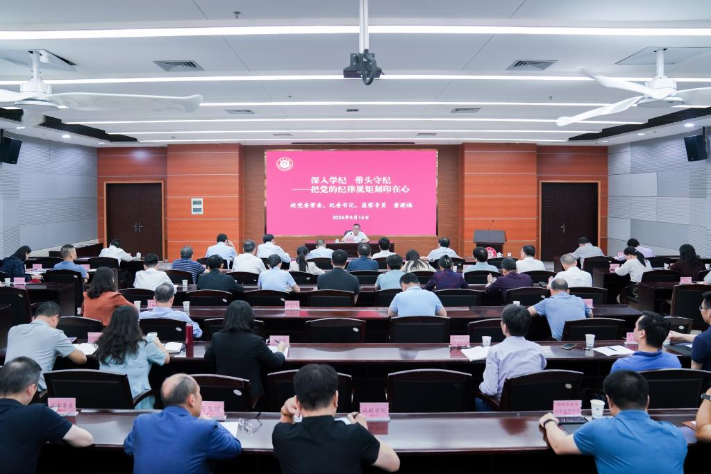 校党委常委、纪委书记、监察专员童建福作《深入学纪 带头守纪——把党的纪律规矩刻印在心》专题报告,详细解读《中国共产党纪律处分条例》(以下简称《条例》)修订情况和廉洁纪律方面修订的主要内容,深入剖析常见的违反廉洁纪律行为和我校典型案例。他指出,《条例》的修订是促进全党深刻领悟“两个确立”的决定性意义,坚决做到“两个维护”的必然要求;是贯彻落实习近平新时代中国特色社会主义思想的具体行动;是坚持问题导向,用严明的纪律管全党治全党的现实需要;是总结从严管党治党经验、实现制度与时俱进的实践要求。他强调,高校是全面从严治党的重要阵地,我们要以学习贯彻新修订《条例》为契机,全面学习深入领会《条例》主旨要义,加强党纪教育,增强遵规守纪自觉,敢于善于斗争,严格精准执纪,推进全面从严治党工作走深走实。
