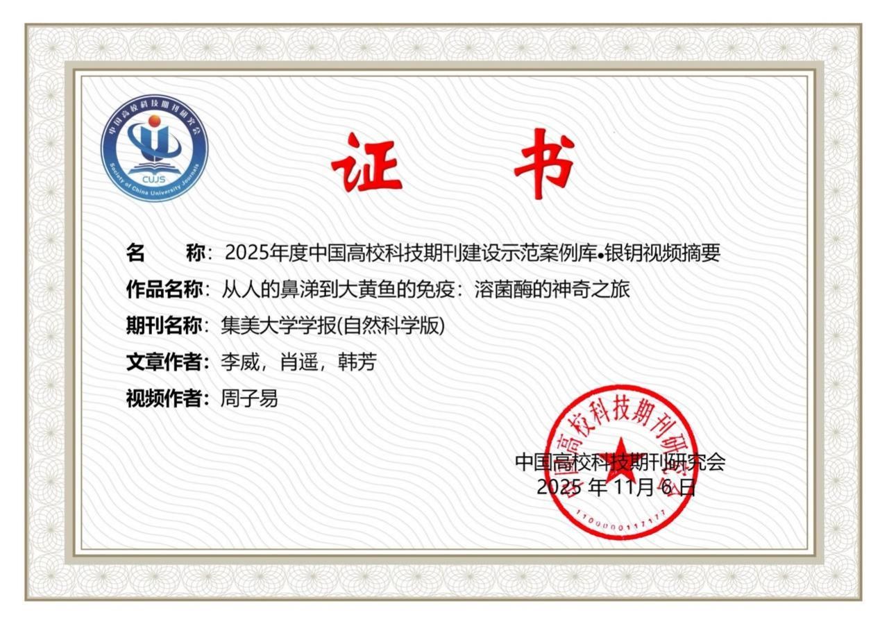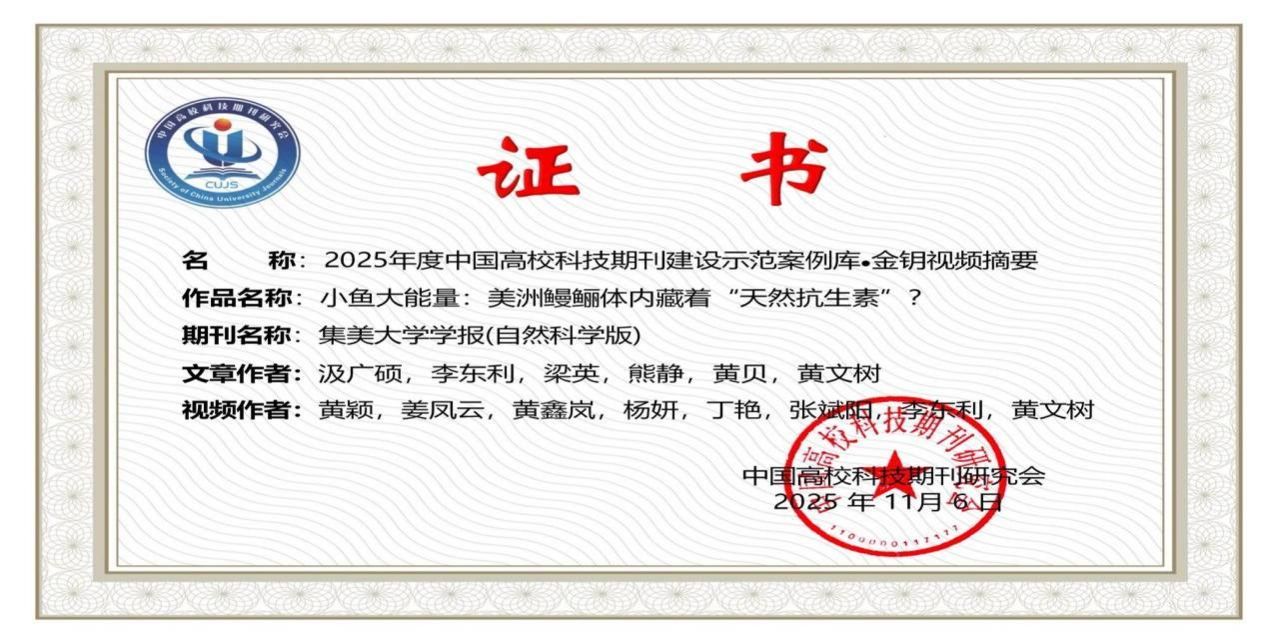 11月8日,第二届“中国高校科技期刊建设示范案例库·金钥/银钥/铜钥视频摘要”评选结果正式公布。本次活动由中国高校科技期刊研究会出版融合工作委员会主办、中国知网协办。我校《集美大学学报(自然科学版)》推荐、水产学院研究生团队精心创作的两项视频摘要作品在全国高校众多参赛案例中脱颖而出,分获金钥奖与银钥奖,展现出科学内容与视听表达兼具的传播力。