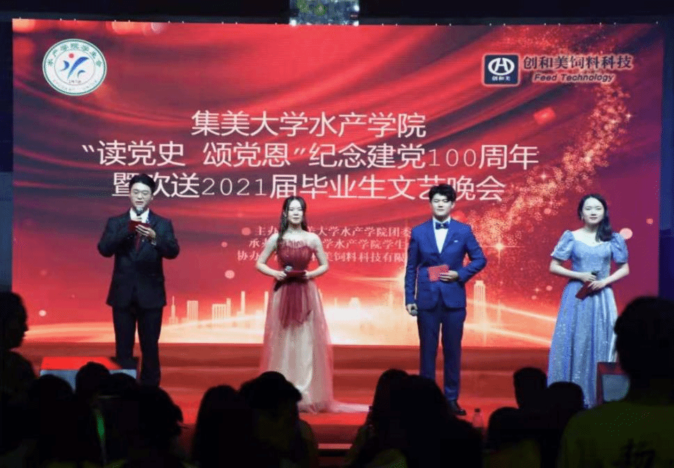 6月5日晚,由集美大学水产学院团委主办,集美大学水产学院学生会承办,厦门创和美饲料科技有限公司协办的“读党史,颂党恩”庆祝建党100周年暨欢送2021届毕业生文艺晚会在学院排球馆举行,校团委书记吴薇、院党委副书记黄庆胜,厦门创和美饲料科技有限公司董事长吴新安,毕业班班主任代表和全体辅导员出席了晚会。