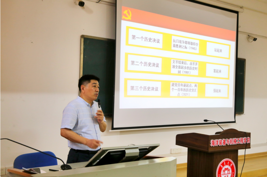 6月1日,海洋装备与机械工程学院党委书记陆宝忠走上讲台,围绕学习贯彻党的十九届六中全会精神,以《中国共产党百年奋斗的重大成就和历史经验》为题为学院师生讲述一堂生动的思政课。