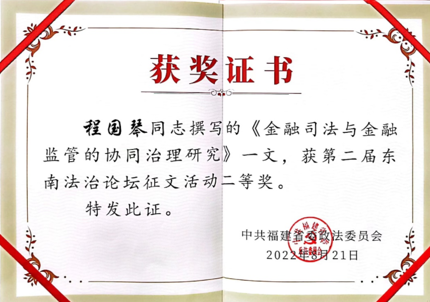 东南法治论坛是由福建省政法委主办,福建省法学会承办的高端法治论坛,致力于为打造法治强省和推进法治化营商环境建设注入新动力,推动法治成为福建发展核心竞争力,是福建省充分发挥其作为习近平法治思想重要孕育地和实践地这一优势,深入贯彻习近平法治思想的具体行动和重要举措。第二届东南法治论坛暨主题征文活动,得到全省广大法学法律工作者的积极响应。论坛共征集到有效论文1273篇。经有关单位组织初评,共推荐212篇论文进入终评。省法学会成立优秀论文评审委员会,经双向匿名评审及公示,评出获奖论文146篇,其中,一等奖15篇、二等奖30篇、三等奖45篇、优秀奖56篇。