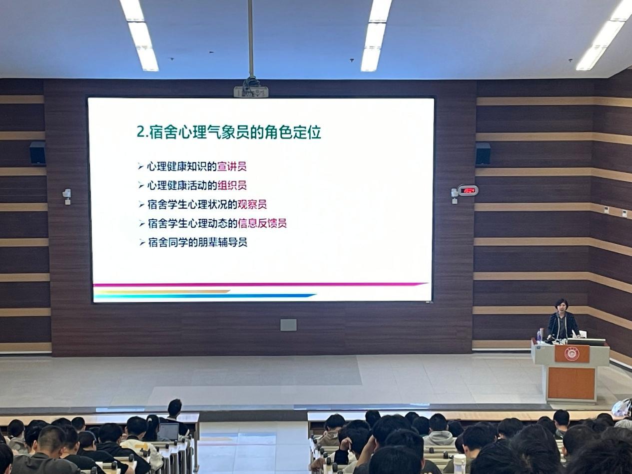 会上,周鸣结合实际案例讲解了设置宿舍心理气象员的意义及工作职责,提出在与同学交往过程中应保持真诚,尝试共情、注意观察、及时反馈、倾听等助人技巧,并分享了工作中的常用技术。