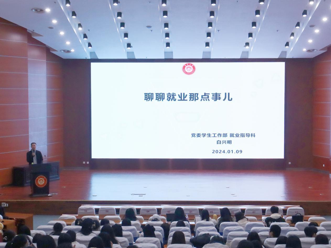 1月9日晚,师范学院组织召开2024届毕业生就业指导讲座,校学生处就业指导科副科长白兴明应邀主讲,2020级全体学生到场聆听。