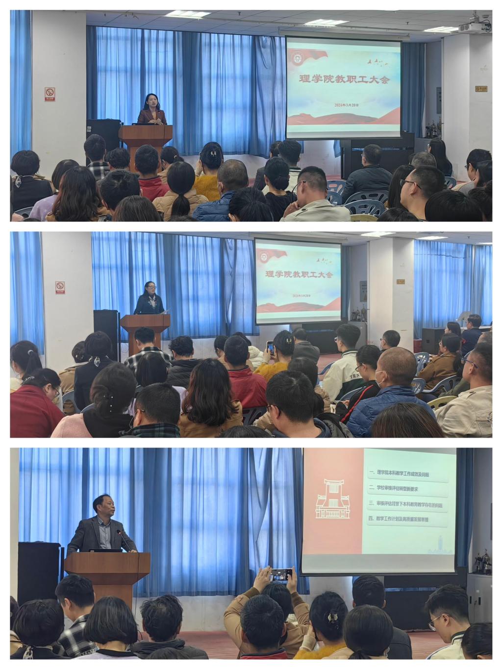 为更好地迎接本科教育教学审核评估工作,3月20日下午,理学院召开教职工大会,院党政领导班子、科级干部、各系室主任以及全院教职工参加,院长宾红华主持。